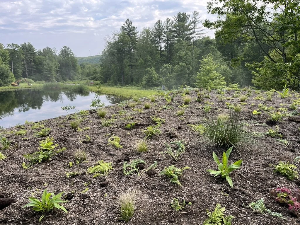 Widening Circles installed a green roof on top of a dining pavilion on a residential property in Austerlitz, NY in the spring of 2025, with the goals of integrating the pavilion in the surrounding meadows and woodlands and reducing stormwater runoff. The plant palette of the green roof is comprised of mostly native plants, including sedums, Carex appalachia, purple love grass, little bluestem, violets, columbine, nodding onion, and more. The green roof is part of a larger installation which we are excited to share more photos of next season.